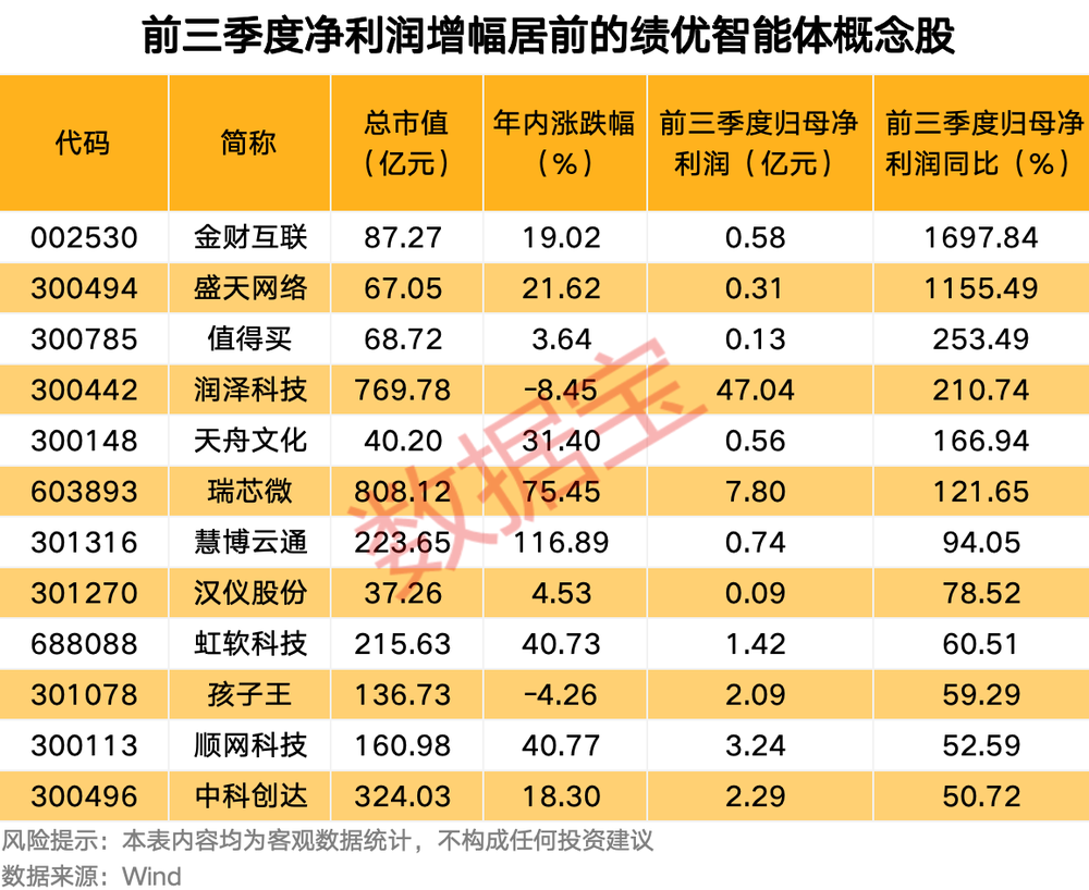 从业绩表现来看,目前70余只智能体概念股发布前三季度业绩报告,润泽科技的净利润规模最大。金山办公、瑞芯微、协创数据、网宿科技、萤石网络的净利润规模居前。金财互联、盛天网络、值得买、润泽科技、天舟文化、瑞芯微的前三季度净利润增幅均超100%,业绩实现翻倍。
