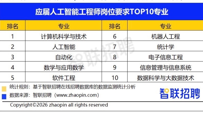 从行业选择上看,计算机软件、人工智能、互联网是吸纳AI应届生的前三大需求方。在专业要求方面,计算机科学与技术、人工智能、自动化三大专业最受企业青睐;此外,数学与应用数学、统计学等理科基础学科,以及软件工程、电子信息工程等应用型专业的毕业生也同样备受市场欢迎。